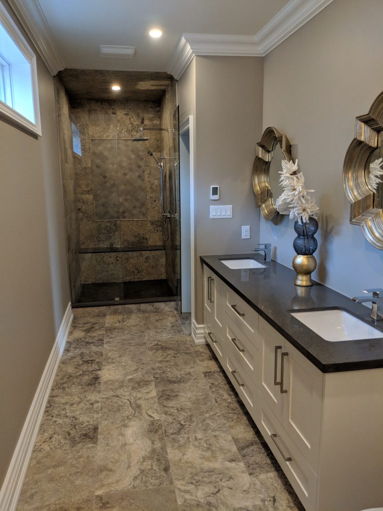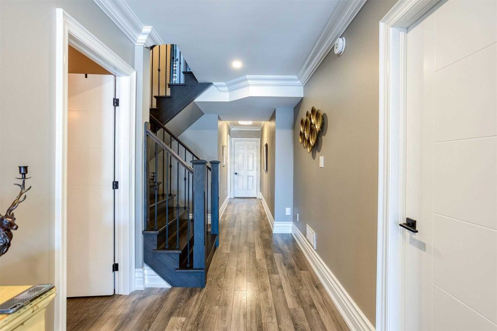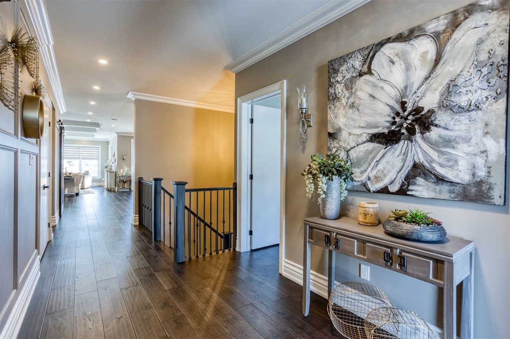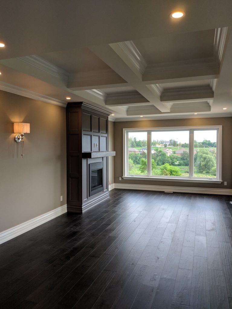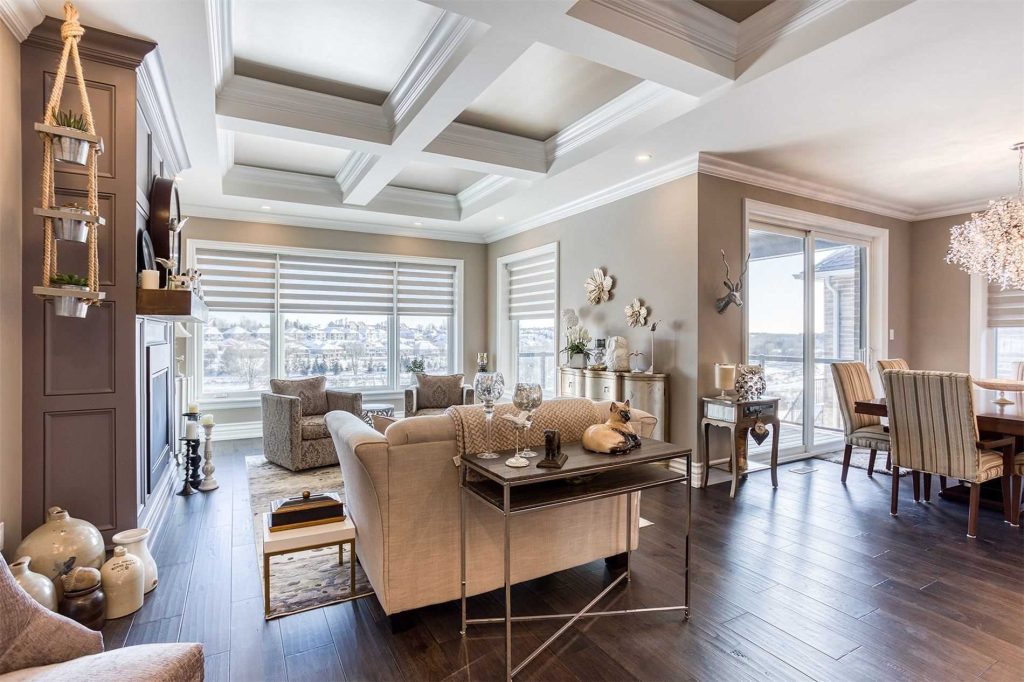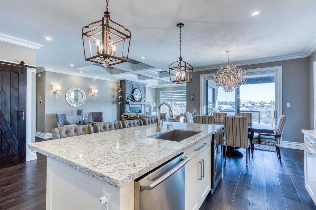 This bungalow with a walk-out basement, backs onto the Conestogo River, in the lovely town of Drayton. Large windows in the rear were used to capitalize on the amazing views. The 10ft high coffered ceiling in the great room and crown molding through out most of the house adds to it’s charm.